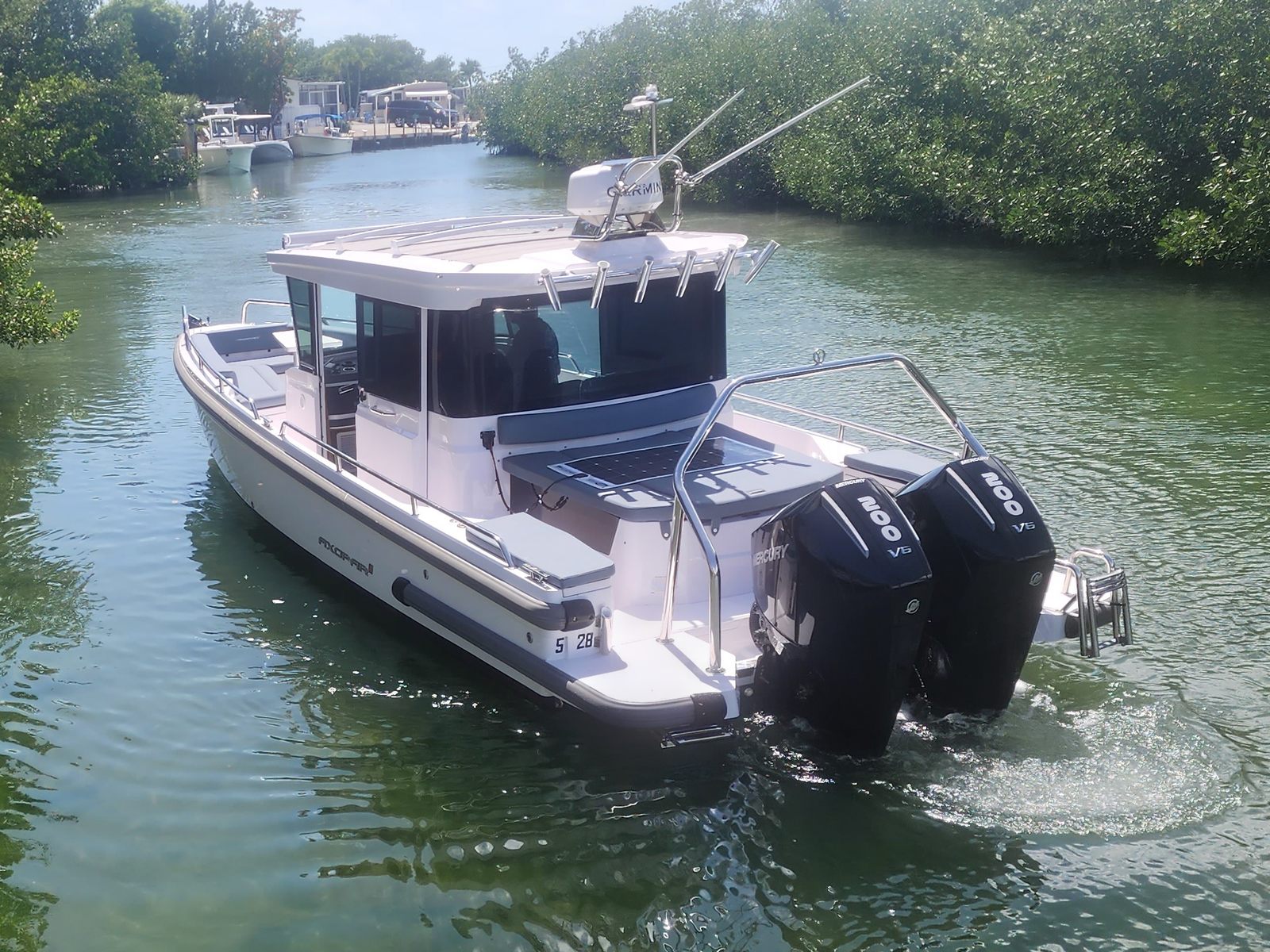 The 2023 Axopar 28 Cabin is as practical as it is fun. The center console design makes docking and maneuvering straightforward, even for less experienced boaters. The ample storage space allows you to bring along everything you need for a day on the water, from fishing gear to picnic supplies.Fuel efficiency is a hallmark of the Axopar brand, and the 28 Cabin is no exception. The efficient hull design and twin-engine setup help you go farther on every tank, reducing operating costs and maximizing your time on the water. Maintenance is simplified thanks to the high-quality construction and reliable engineering, so you can spend less time worrying about upkeep and more time enjoying your boat.