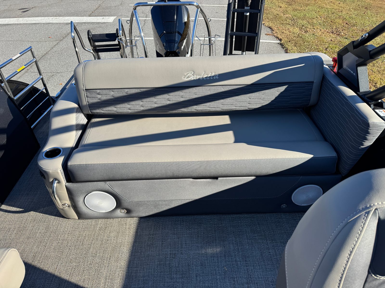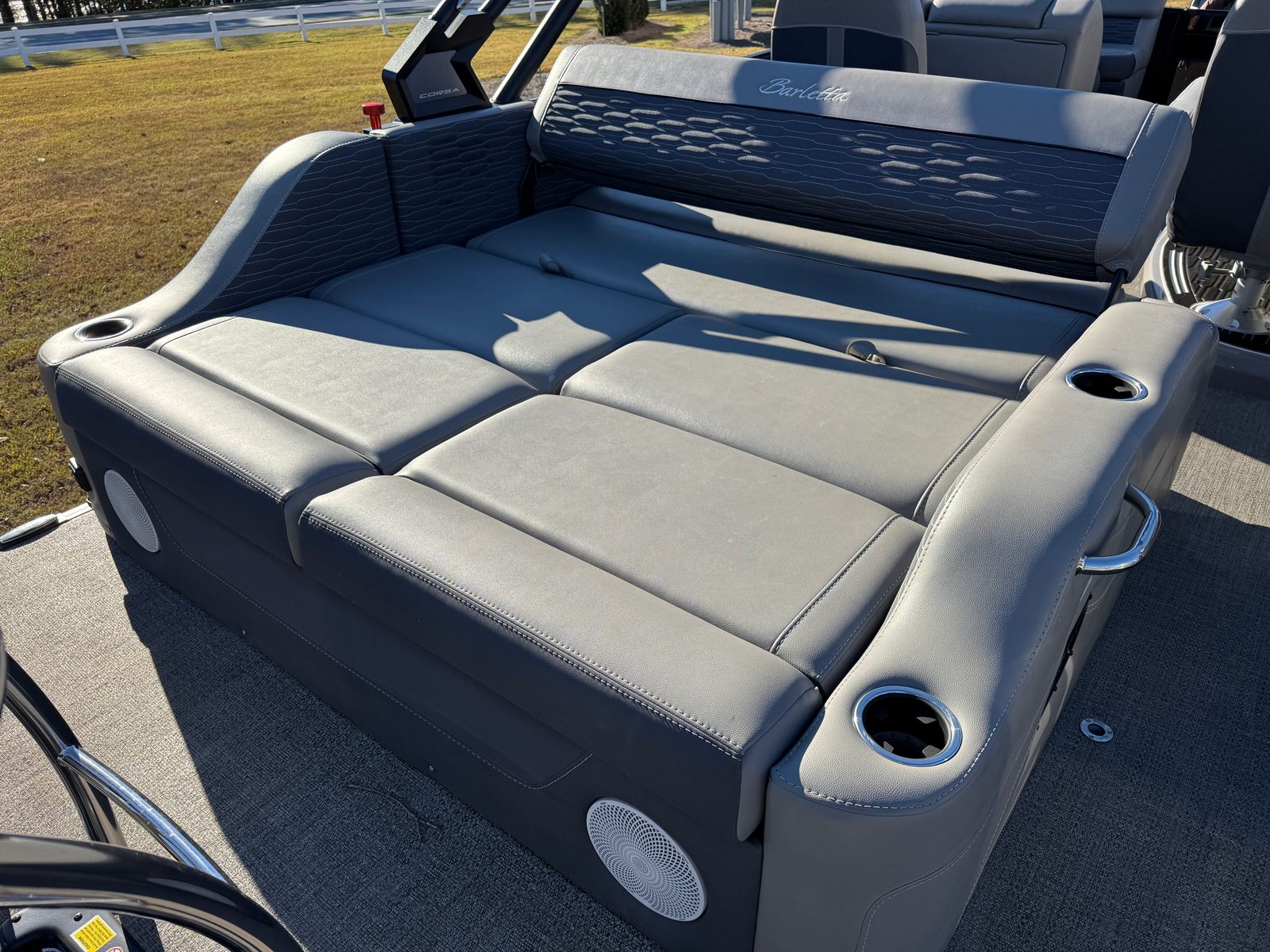 The 2023 Barletta Corsa 23UCA is thoughtfully designed to maximize comfort, convenience, and enjoyment. Its 25-foot length provides ample space for socializing, sunbathing, or simply relaxing with your favorite people. The pontoon’s layout is optimized for versatility, making it easy to transition from a lively party atmosphere to a tranquil retreat. High-quality materials and finishes throughout the boat ensure durability and a premium feel, while the ergonomic seating arrangements offer exceptional comfort for long days on the water. Every detail, from the stylish helm to the spacious deck, is crafted to enhance your boating experience and make every outing memorable.