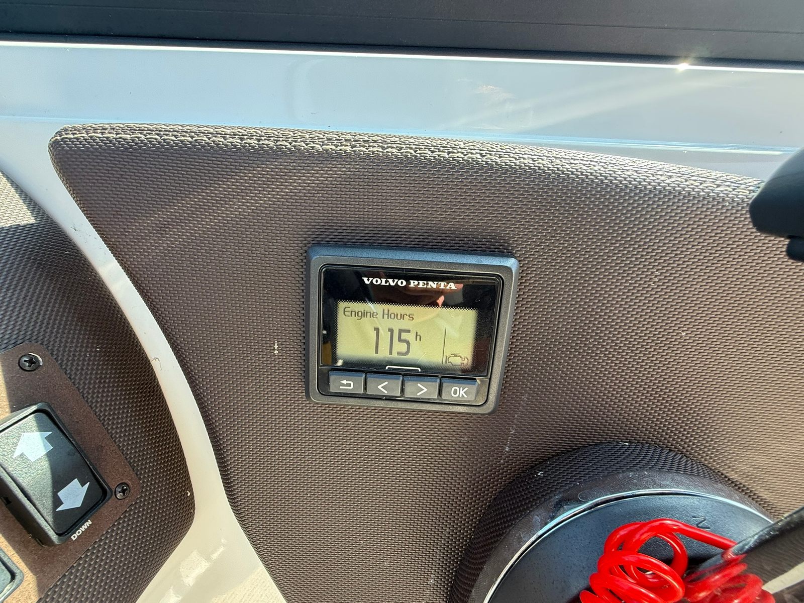 Ergonomic helm setup with full instrumentation, including depth finder and air/water temp gauge.
