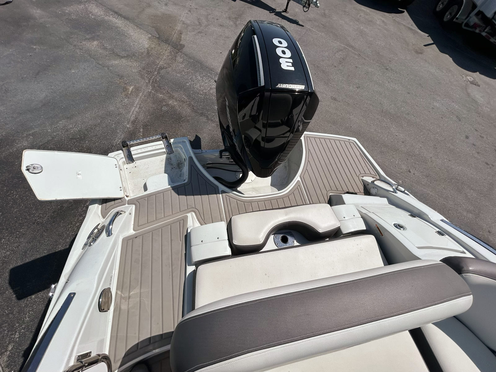 Powered by a Mercury 300 outboard, this Crownline offers strong, efficient performance with the added benefits of simplified maintenance, shallow water capability, and a clean, open engine compartment layout. The outboard configuration also enhances usable cockpit space and makes boarding and water access more convenient from the transom.