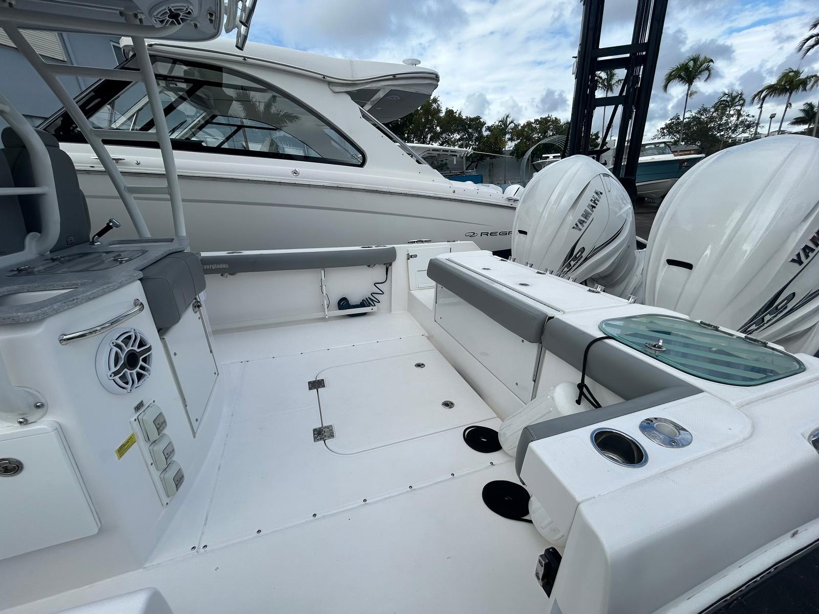 Beyond its luxurious features, the Everglades 365 CC is designed with practicality in mind. The spacious deck offers plenty of room for gear, coolers, and water toys, making it easy to prepare for any adventure. The intuitive joystick and autopilot systems simplify docking and tight maneuvers, reducing stress and increasing confidence for captains of all experience levels.Fuel efficiency is enhanced by the advanced Yamaha engines, allowing you to enjoy longer trips without frequent stops. The auto engine freshwater flush system streamlines post-trip maintenance, saving you time and effort. The durable canvas package and bow shade protect both passengers and the boat’s interior from harsh weather, ensuring your investment remains in top condition.