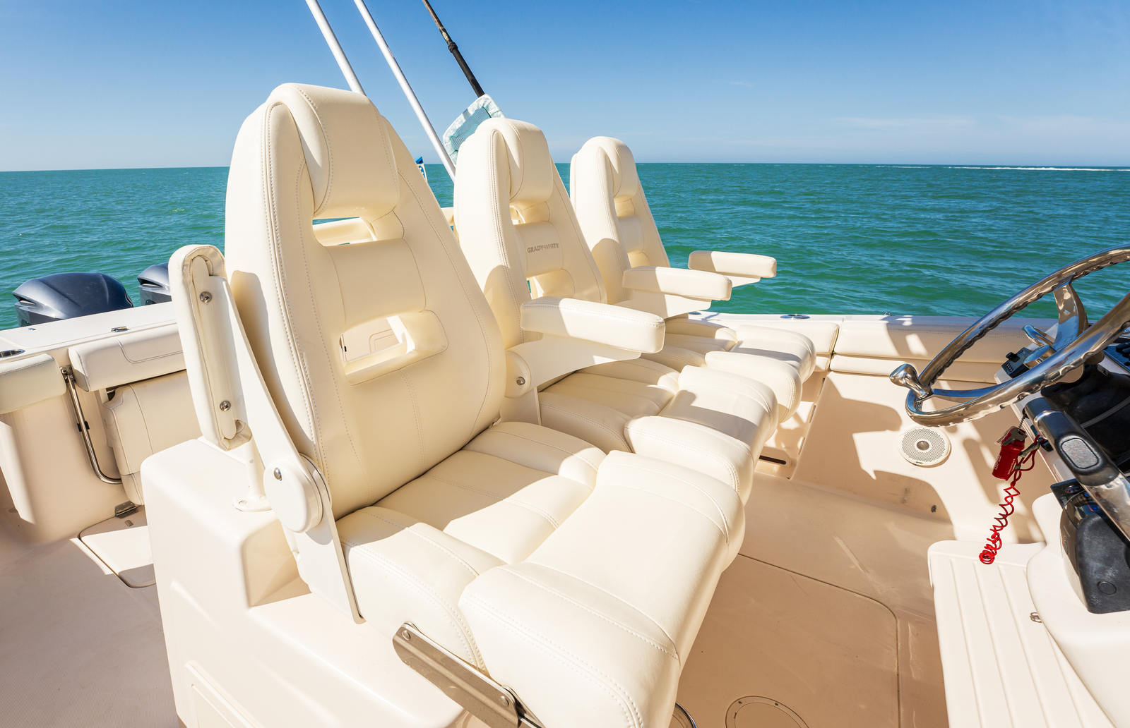 - Seating - lean bar mounted Deluxe III horizontally adjustable helm chairs w/footrest & flip-up bolsters (3)