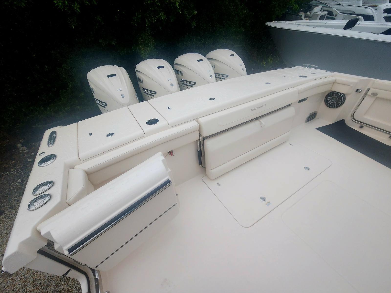 The Grady-White Canyon 456 is designed with practicality in mind, making ownership as enjoyable as it is effortless. The quad Yamaha XF450 engines not only deliver impressive speed but also offer reliability and fuel efficiency, allowing for longer trips with fewer stops. The 22-foot outriggers are ideal for serious anglers, providing the reach and stability needed for trolling and deep-sea fishing. The helm enclosure and Jit Top underside enhance comfort and protection, making it easy to enjoy the boat in a variety of weather conditions. Docking and maneuvering are simplified by the boat’s advanced engineering, while ample storage ensures that all your gear and essentials are always within reach. Whether you’re planning a weekend getaway or a day trip with friends, the Canyon 456 is equipped to handle it all with ease.