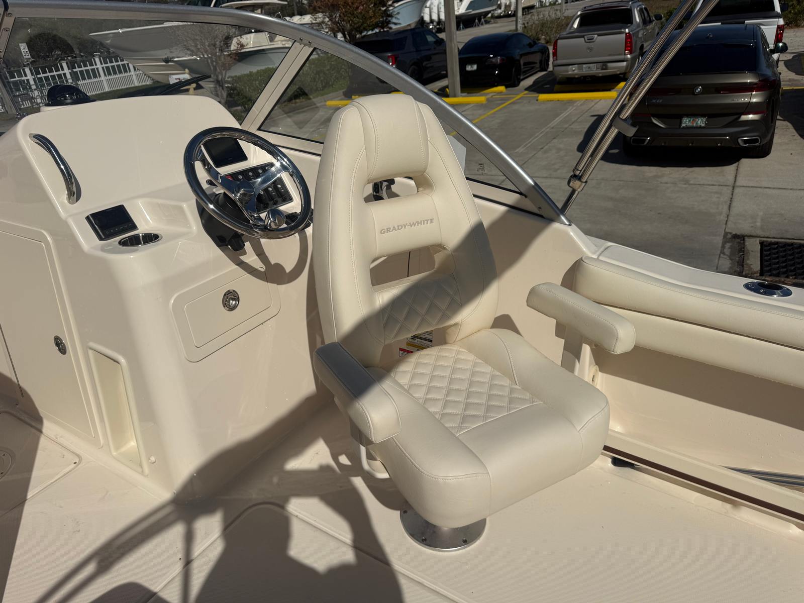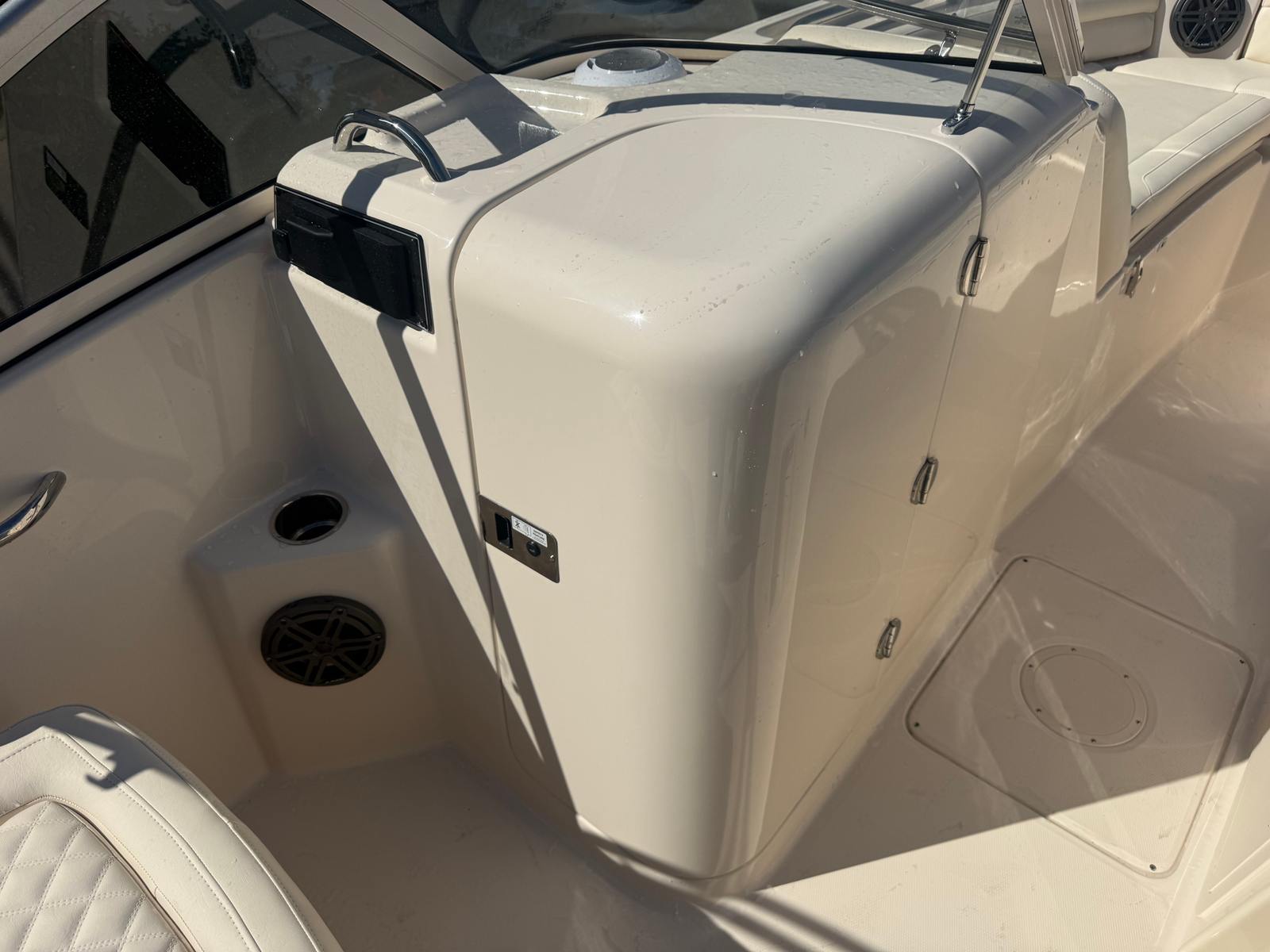 The Grady-White Freedom 215 is loaded with special features that enhance comfort, convenience, and enjoyment on the water. The install Silve Logos add a touch of elegance and brand distinction, while the lounge seat on the port side with a sliding back offers versatile seating arrangements for relaxation or socializing. The cockpit shower provides a refreshing rinse after a swim or a day in the sun, and the sun platform insert with cushion creates a spacious area for sunbathing or lounging.For anglers, the raw water livewell is a valuable addition, keeping bait fresh and ready for action. The raw water wash down makes cleaning up after a successful fishing trip quick and easy. The black aft tonneau cover offers protection for your boat’s interior when not in use, preserving its pristine condition. Every detail, from the gel coat to the seating, is designed with both aesthetics and functionality in mind, ensuring a premium boating experience.