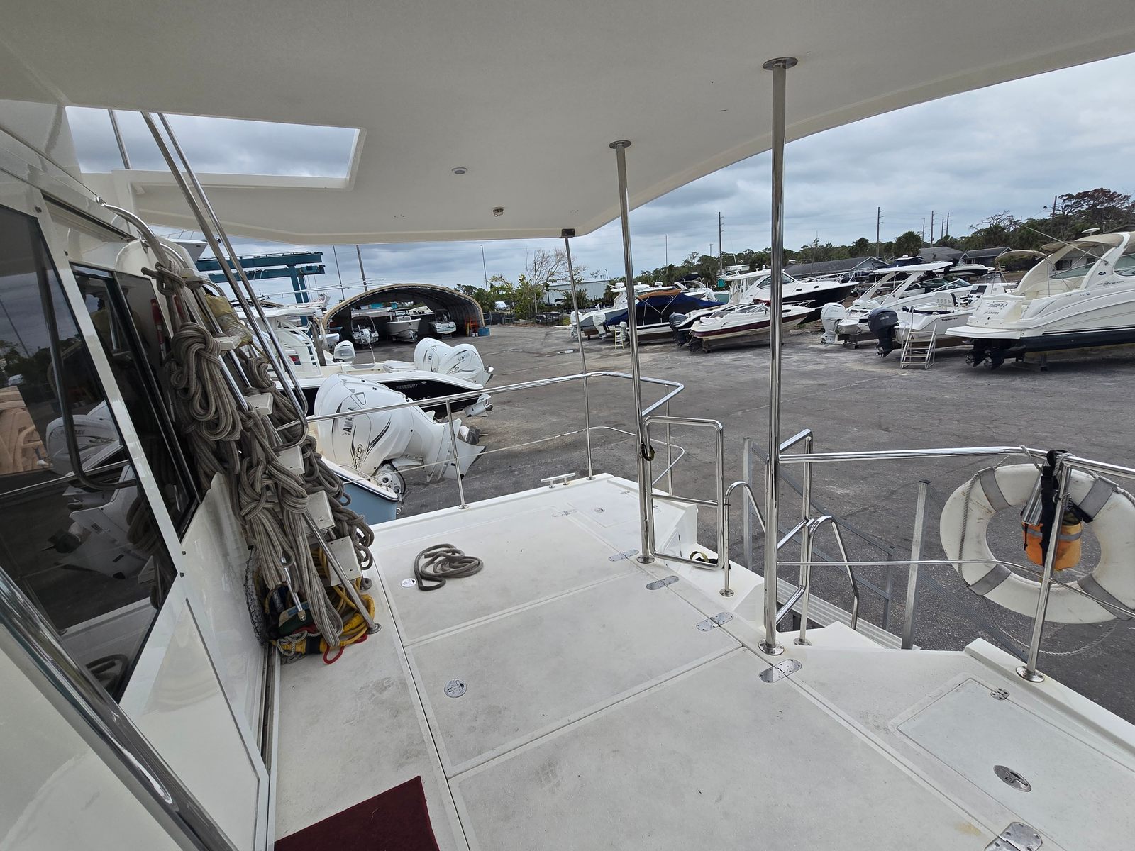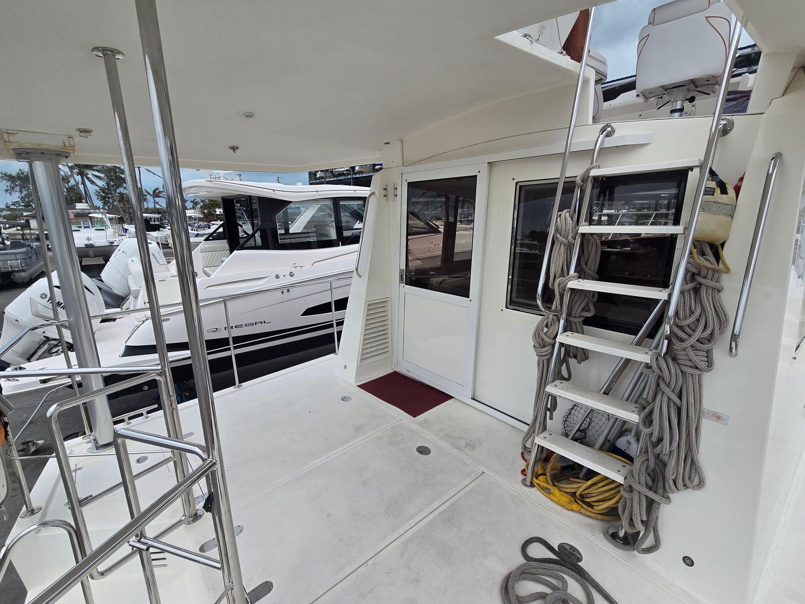 Hull #3, she was originally purchased by a technician who worked for the company that brought these boats into the U.S. Because of his role and experience, he was able to work directly with Island Pilot during the build process and had this boat constructed to a higher standard than the rest. While the typical Island Pilot 395 displaces around 30,000 lbs, this one was purposely built heavier—just under 40,000 lbs—making her exceptionally solid, stable, and confident in heavy seas. That extra weight translates into a smoother, safer, and more enjoyable ride whether you’re running offshore or navigating inland waters.