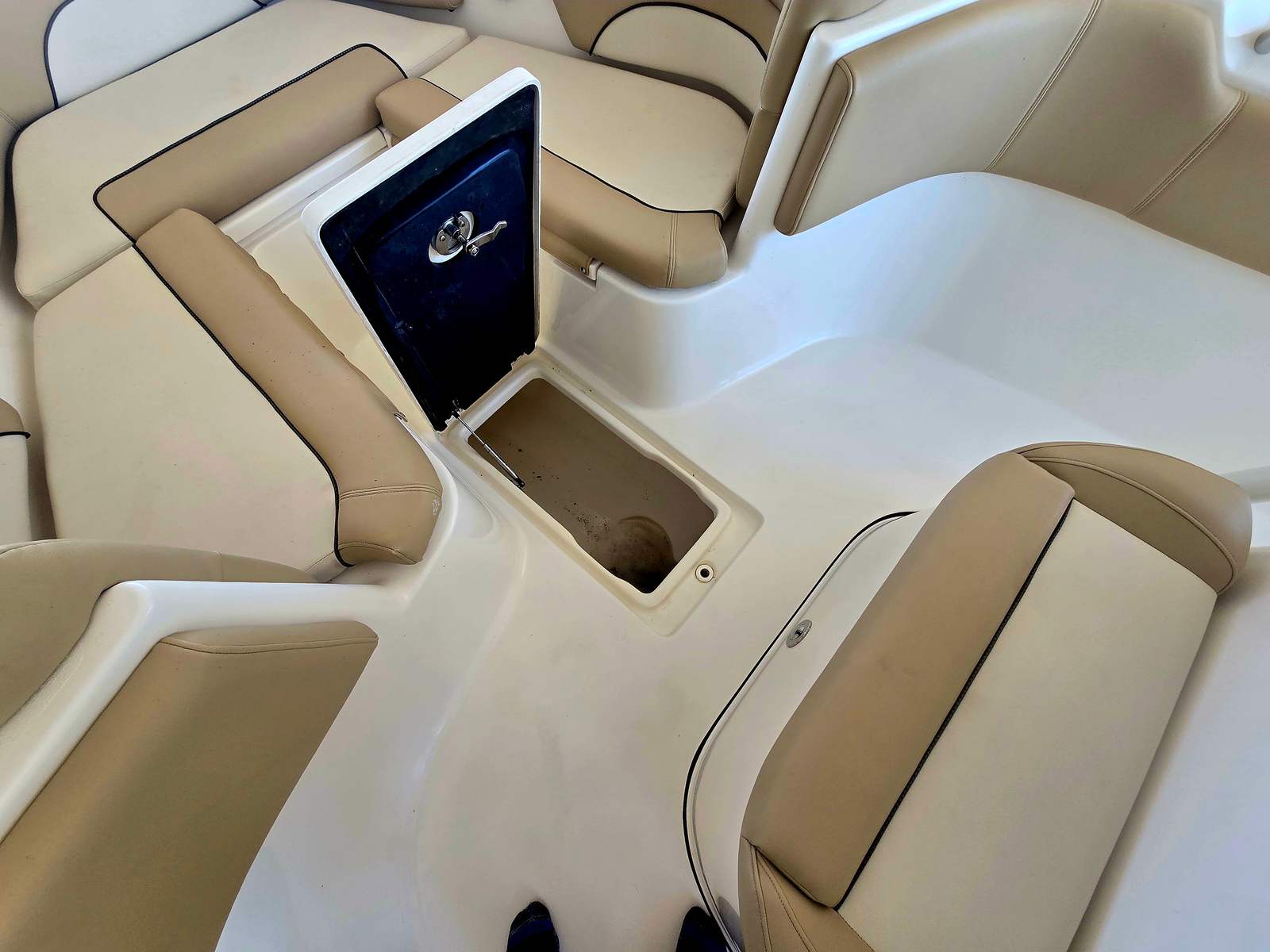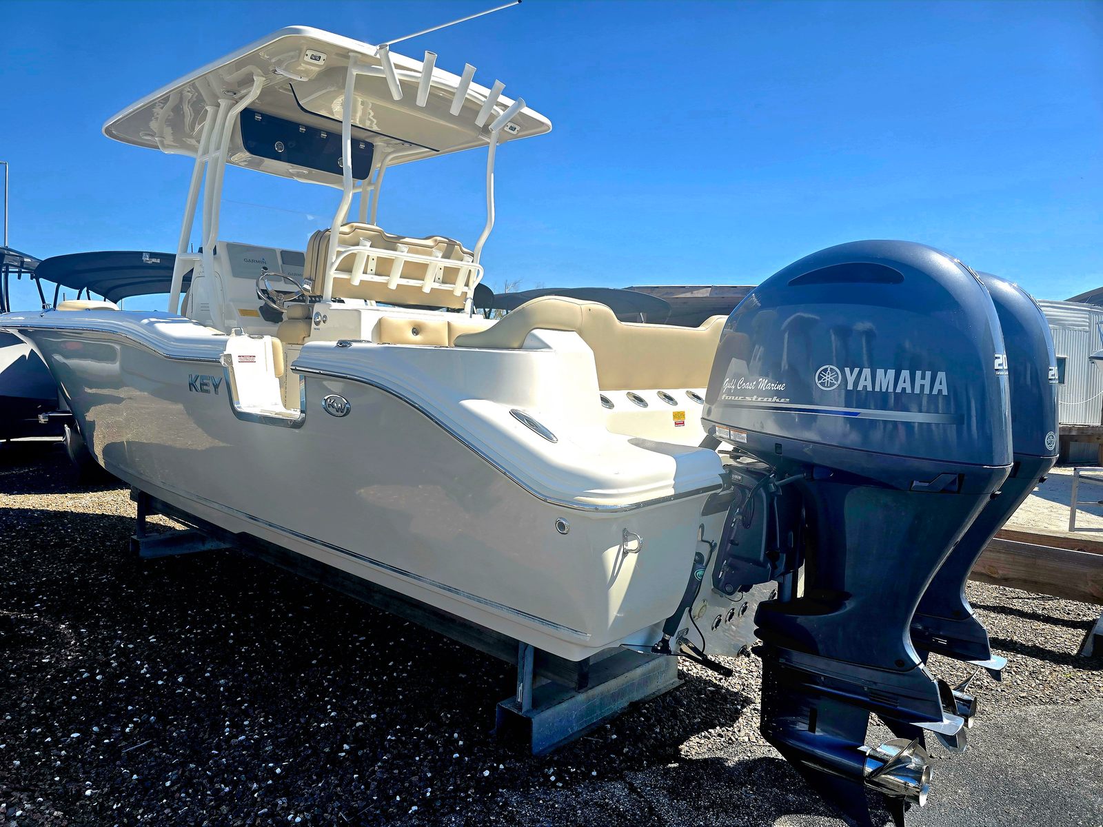 This very clean 2020 KeyWest 263 FS has many amenities such as side step dive door with an integrated ladder, forward seating with removable backrest in a full width rear bench seat, very large dual live wells located in the stern. Also has dual large in floor fish boxes. This is powered by twin Yamaha 200s with about 110 hours.