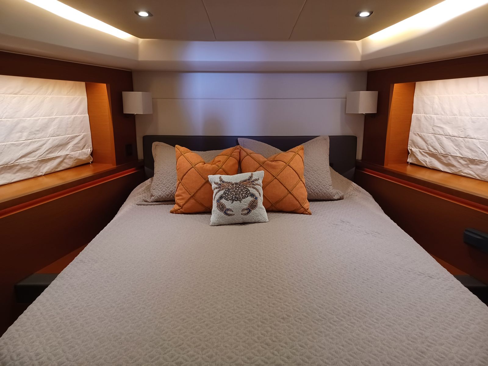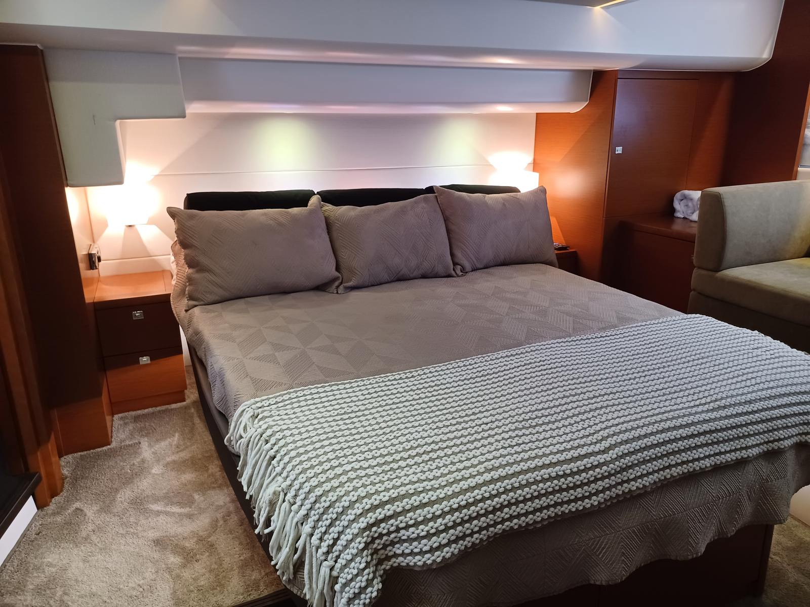 The Prestige 550 Flybridge is a 3-stateroom, 2-head layout with a private master suite amidships with a private entrance from the guest quarters. The master has a spacious ensuite head with separate stall shower and a walk-in closet. There is a spacious VIP stateroom forward and a third guest stateroom with side-by-side single berths. These share the guest/day head which is equipped with a separate stall shower and electric freshwater flush head. Additionally there is a separate crew cabin and head accessible from the transom.