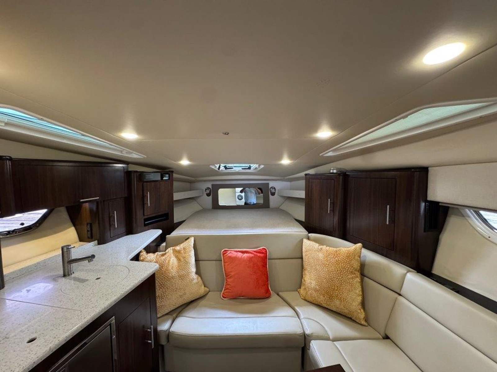Below deck, the salon is both stunning and spacious, featuring L-shaped seating for entertaining. At the touch of a button, the seating converts into a queen berth. The aft cabin offers a private retreat for reading or watching a movie by day, and easily transforms into a queen bed at night.