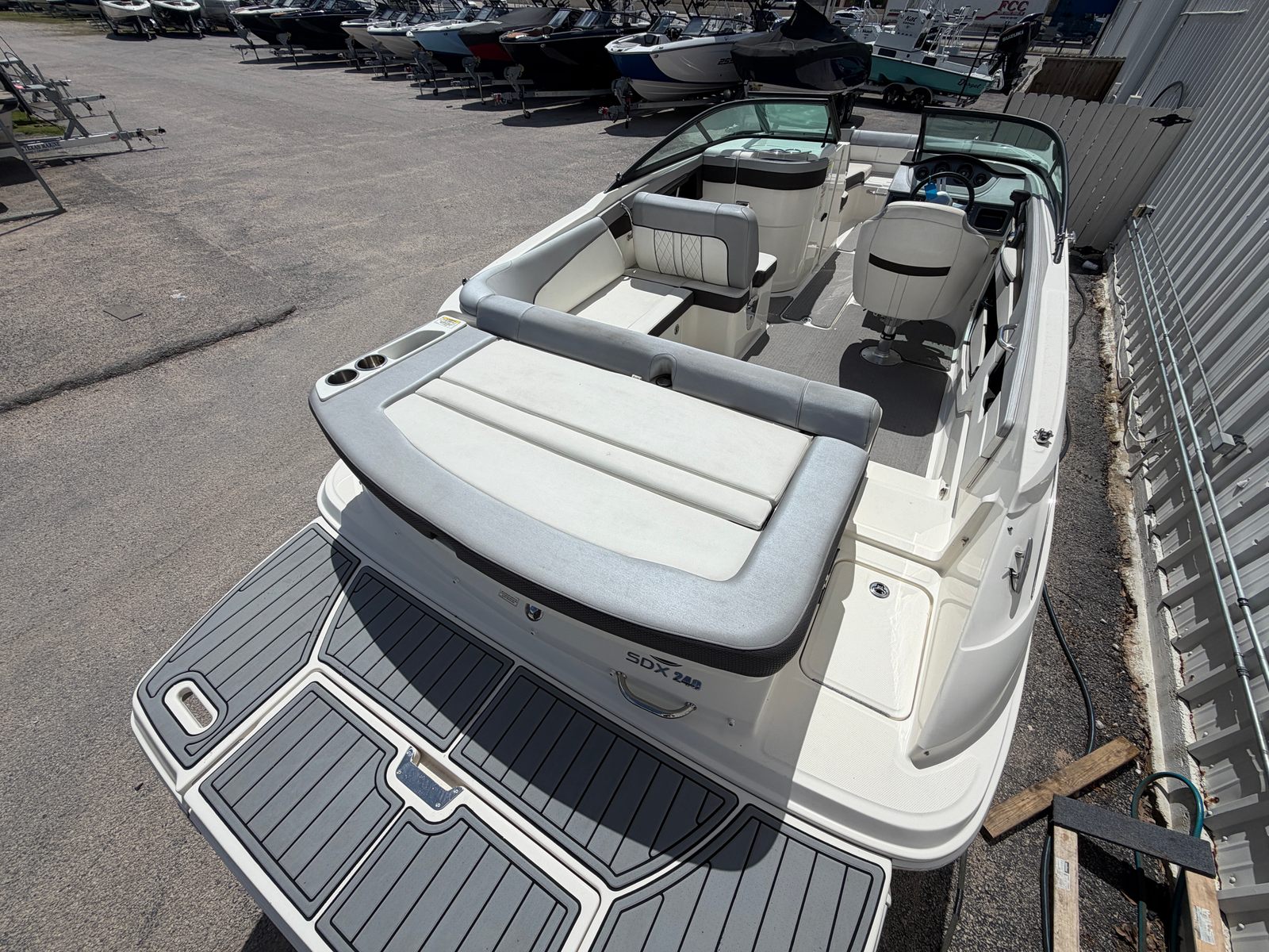 The Sea Ray SDX 240 is designed with practicality in mind, making ownership as enjoyable as the time spent on the water. The tandem axle trailer with swing tongue offers easy towing and maneuverability, whether you’re heading to a nearby lake or exploring new coastal destinations. The cover protects your boat from the elements, reducing maintenance and preserving its appearance. Annual service means you can trust the engine’s reliability, while the dual prop system provides efficient fuel consumption and improved handling. Docking is a breeze thanks to the responsive controls, and the spacious deck offers plenty of room for gear, coolers, and water toys.