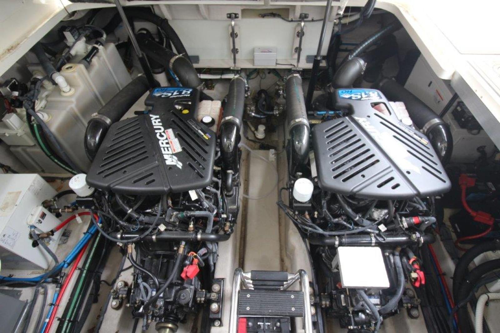 She is powered by twin MerCruiser 8.1S HO engines with 650 hours, paired with a new Westerbeke generator (only 187 hours) that runs strong. Docking is made simple with a bow thruster equipped with new batteries, while navigation is handled by a Raymarine E120 with radar and autopilot.